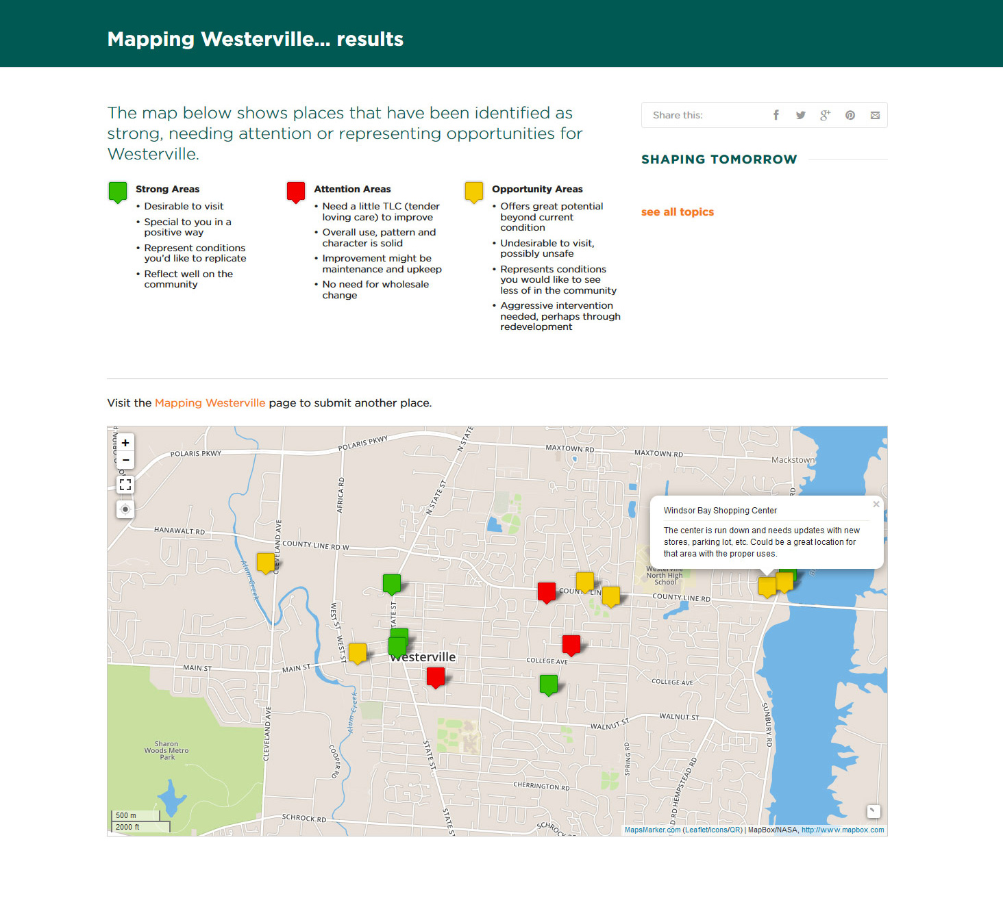 3. Mapping Westerville – Using a map interface, this activity allowed citizens to share input on strong places, weak places and areas of opportunity in Westerville.