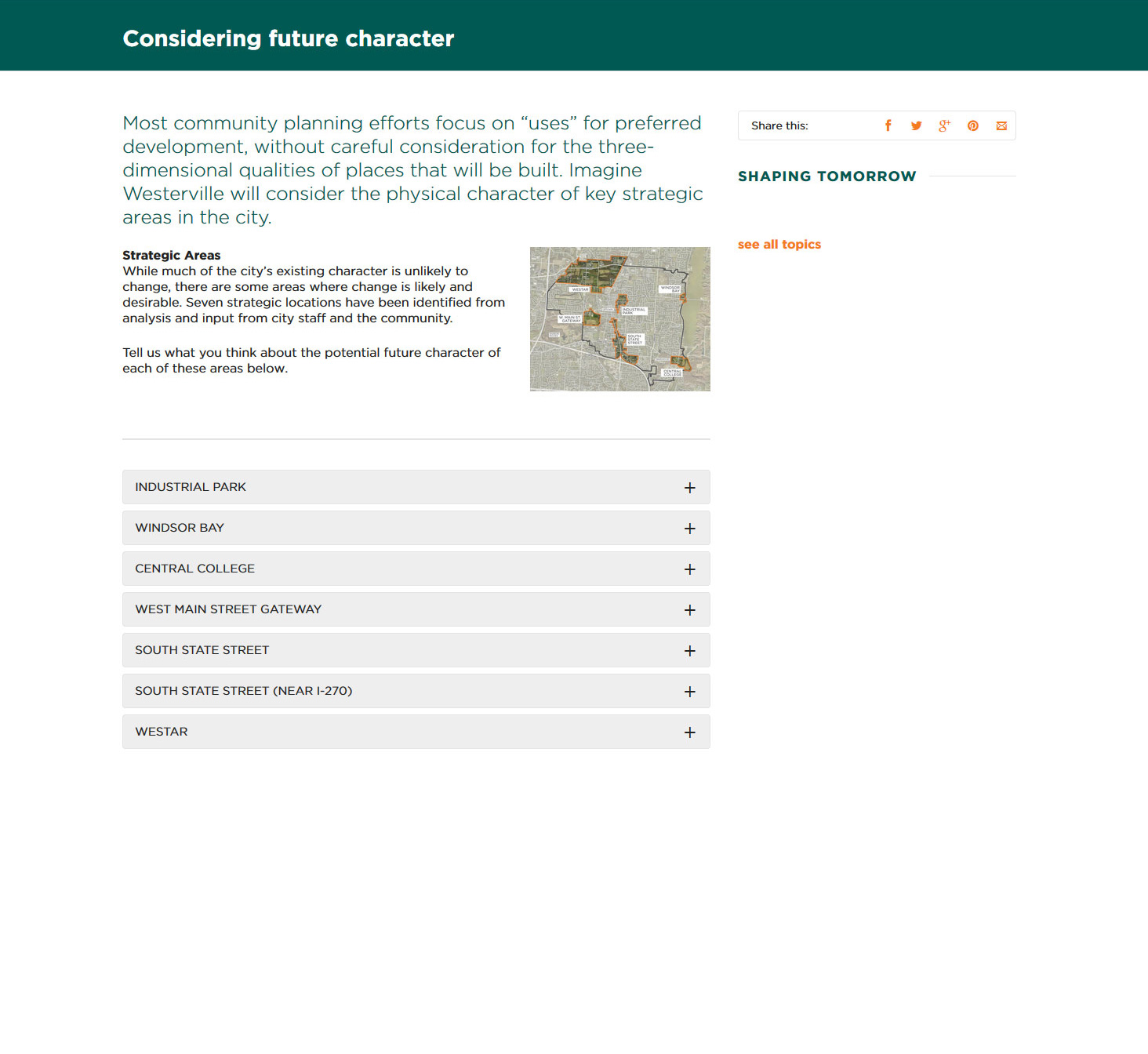 Our work with Imagine Westerville in Westerville, Ohio is a prime example. Following from a three-day kick-off workshop in in August, which was attended by nearly 250 people, we created an interactive, online forum for soliciting additional community input. Building off of the workshop, the web-based tool included four activities: