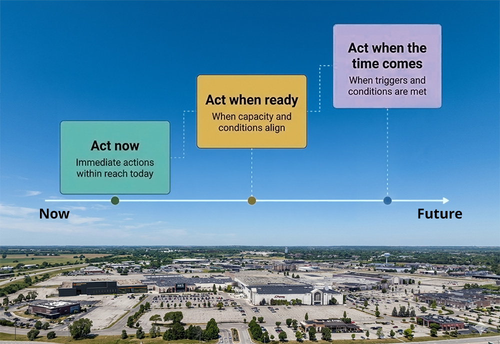 Thinking of implementation from the beginning is critical to this plan’s success. Before drafting recommendations, the team is striving to understand the areas’ triggers and conditions. Each action is analyzed under the framework of whether the Township should act now, act when ready, or act when the time comes. Different situations produce different opportunities.