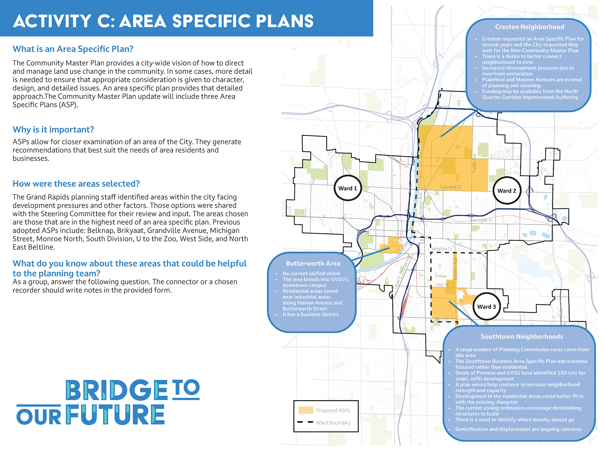 Thank you for participating in the Bridge to our Future launch activities, the first round of public input for the Grand Rapids Community Master Plan. There are six activities and a “tell us about yourself” questionnaire to help the planning team know if the participants are representative of city demographics. Please click on the tabs on the left to get started. The activities can be completed in any order and all questions are optional.