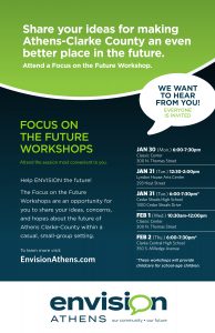 Envision Athens kicked-off in January 2016 and was guided by a 38-member Steering Committee. Public outreach and engagement was vital throughout the process. A series of publicized workshops attracted more than 600 participants and resulted in 4,000 unique comments and ideas. These meetings were coupled with 23 focus group interviews and a two-day stakeholder workshop. The themes derived from this input served as the foundation for the action plan and informed the community’s ten goal statements. For the Community Summit, more than 250 people gathered to hear about major revelations of the process, and affirm the plan’s early direction.
